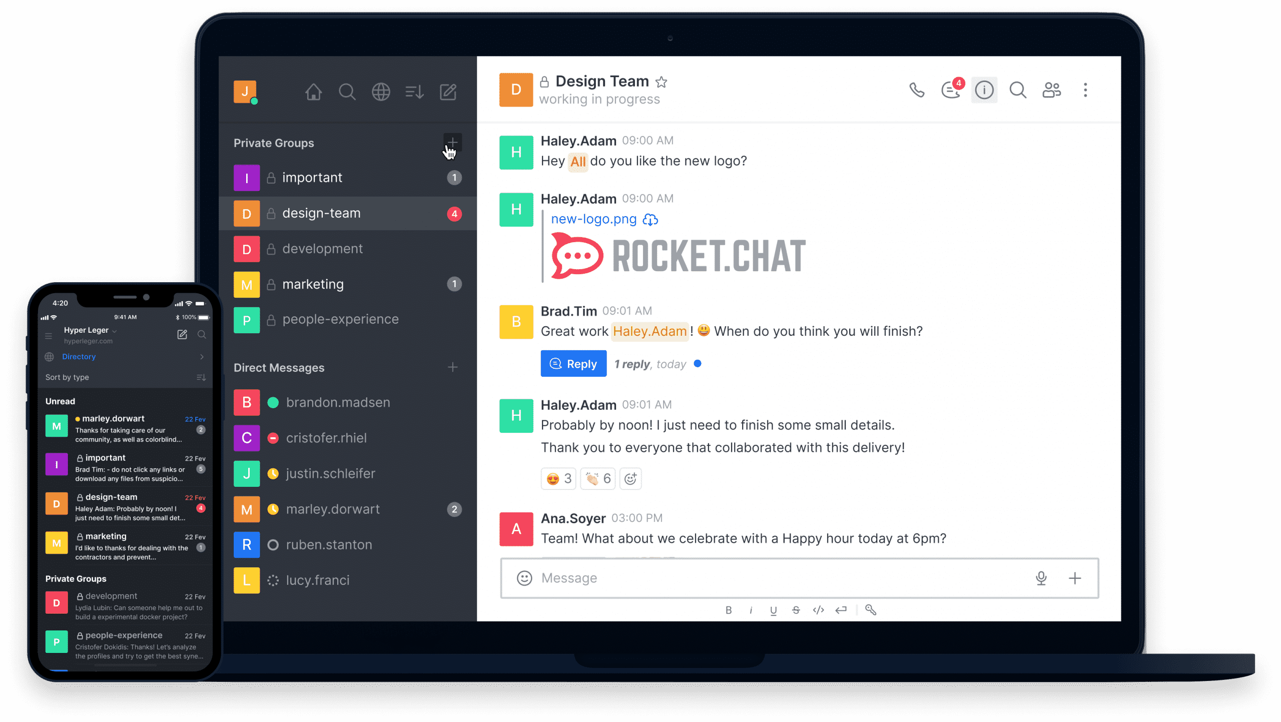 Notre platforme de communication utilise l'application Rocket.Chat. Lorsque configurée, elle sert de portail intranet. Les informations suivantes sont disponibles sur la page d'accueil :